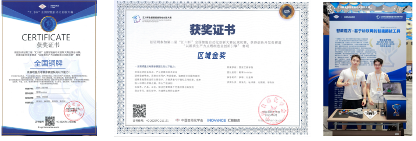 汇川杯全国智能自动化创新大赛作为国内智能自动化领域极具影响力的赛事,始终以 “激发创新思维、推动技术突破、培育行业人才” 为宗旨,吸引了全国百余所高校的数千支队伍参赛。本届赛事以新质生产力点燃制造业创新引擎,聚焦工业自动化智能控制设计,AI视觉检测系统设计等前沿方向,覆盖全国27个省市、432所高校,吸引逾2369支团队、8000多学生报名参赛。我校机电工程学院机械设计制造及其自动化专业学生席浩凡、喻炜炜、刘周翔、李欣悦组成的团队作品《智教魔方——基于物联网的智能擦拭工具》荣获全国铜奖,指导教师机械设计与智能制造系李璟、刘星茹老师。