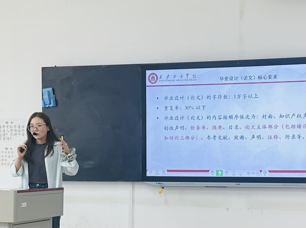 此外,郭丹阳还结合《西安工商学院本科毕业论文(设计)工作管理规定》,逐一明确论文格式规范,包括字体、字号、行距、页码标注、参考文献著录格式等细节,特别提醒同学们注意避免抄袭、剽窃等学术不端行为,强调 “学术诚信是毕业论文的生命线”。