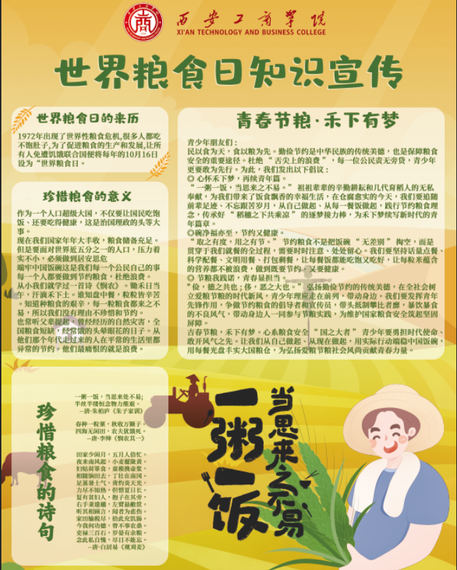 10月16日,在第45个“世界粮食日”来临之际,为坚决遏制餐饮浪费的不良风气,推动珍惜粮食的理念深入师生内心、融入日常生活,我校餐厅开展践行光盘行动,世界粮食日主题活动。