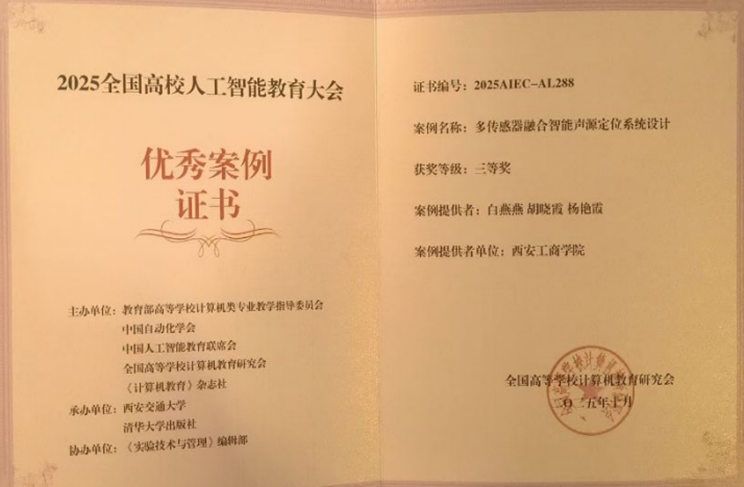 10月17日至19日,为期三天的“2025全国高校人工智能教育大会”在西安隆重举行。本次大会汇聚了全国人工智能教育领域的顶尖专家学者、高校领导及一线教师共计600余人,共同探讨AI前沿趋势,共绘智能教育蓝图。在西安工商学院绿智制造产业学院的组织下,西安工商学院教师团队白燕燕胡晓霞杨艳霞凭借其精心设计的《多传感器融合智能声源定位系统设计》课程案例,从众多参赛作品中脱颖而出,荣获“优秀课程案例三等奖”,展现了我校在应用型人工智能教育改革与创新中的积极探索与扎实成果。