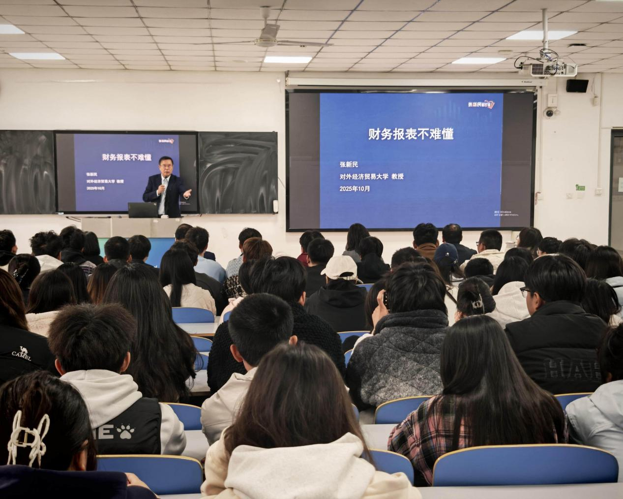 讲座环节,张新民教授以扎实的理论功底与丰富的实战经验,结合上市公司真实案例,对资产负债表、利润表等核心报表展开深入浅出的解读。他从常见财务比率切入,以“战略视角”剖析不同行业企业的财务逻辑与经营实质,有效打破专业知识壁垒,激发学生探究兴趣。互动环节中,张教授耐心解答学生疑问,其生动讲解与独到见解赢得阵阵掌声。