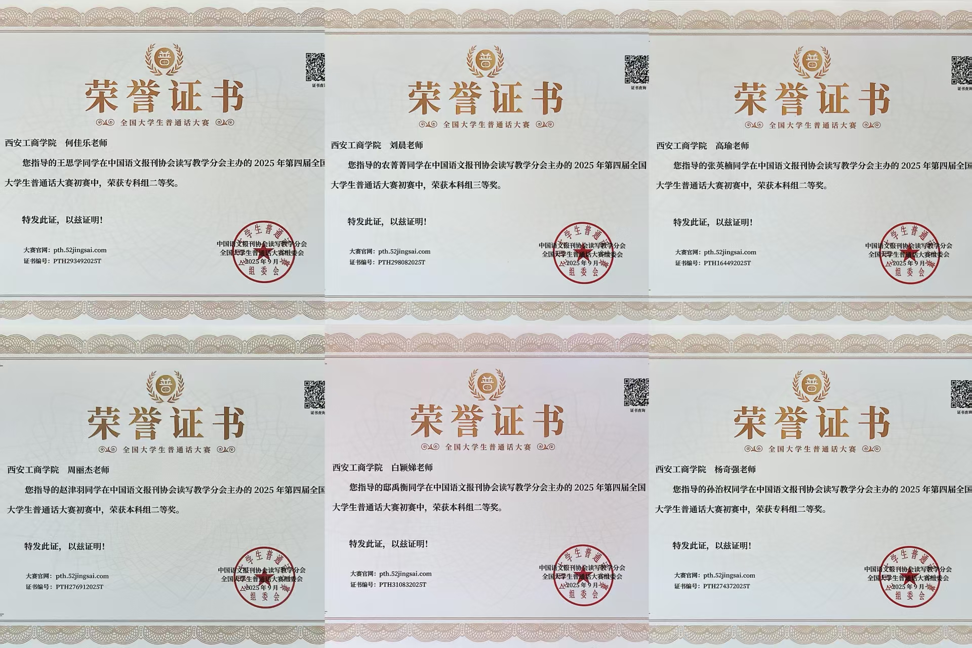 本次大赛全校报名共163人,分布在五个学院,主要是播音与主持艺术、汉语言文学专业。经过前期的赛前培训、学生充分准备,比赛时沉着应战,在字词、朗读、语序判断等多个环节展现出扎实的语言功底和临场应变能力。经过大学生普通话大赛组委会严格评审,近期公布了初赛成绩。西安工商学院学生获得一等奖14项、二等奖56项、三等奖63项,并颁发了优秀指导教师荣誉证书。大赛决赛在11月中旬举行,我校53名同学晋级决赛,决赛成绩将于12月下旬公布。期待学子们在决赛中的精彩表现!