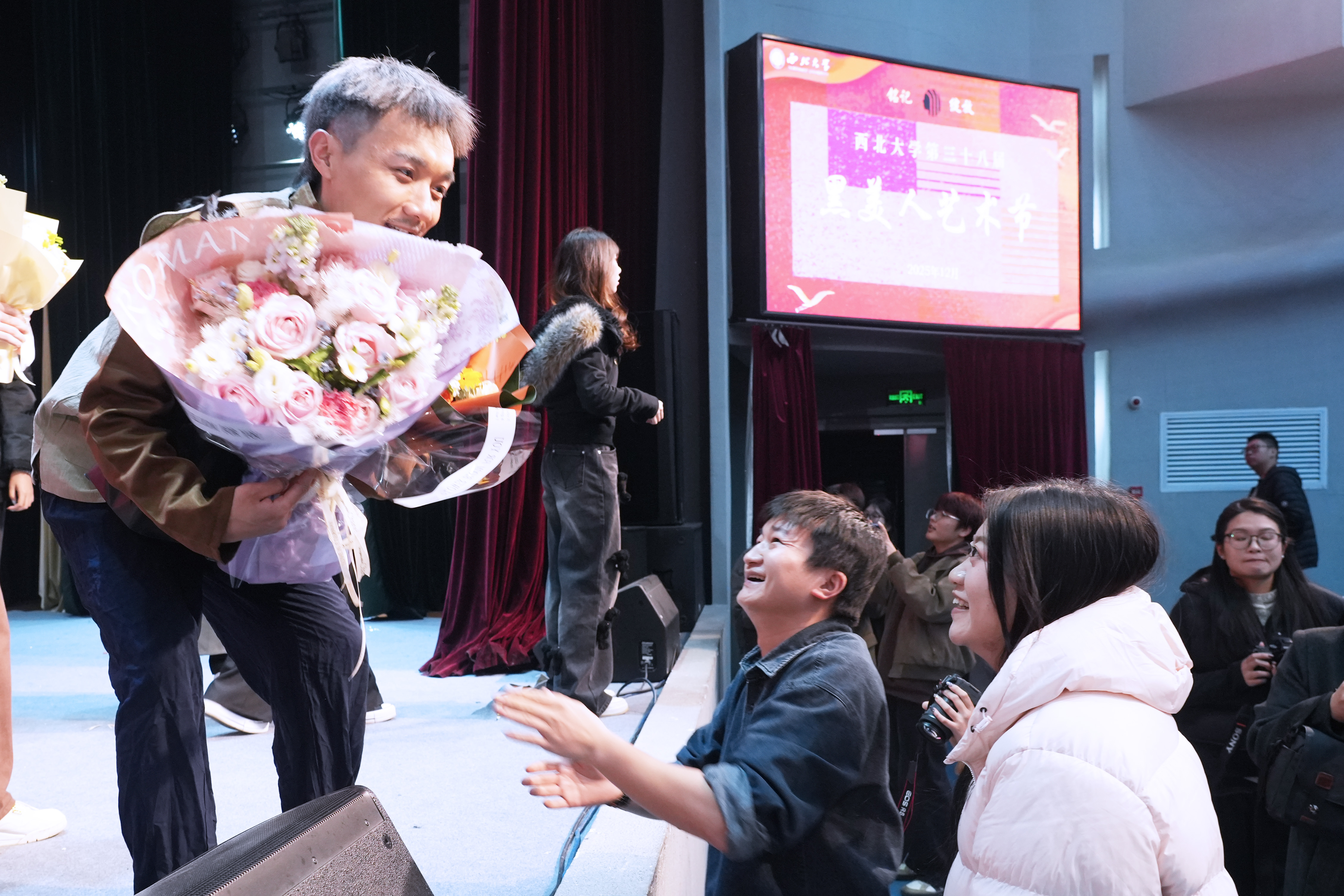 在演出结束后的互动环节,为表达对主办方盛情邀请和演员精彩的演绎衷心感谢,艺传师生代表向话剧团队的演职人员献花并合影留念。这一温馨的举动,不仅传递了艺传师生对舞台艺术工作者的尊重与鼓励,也成为了两校学子之间一次真挚的情感交流,现场气氛热烈而友好。