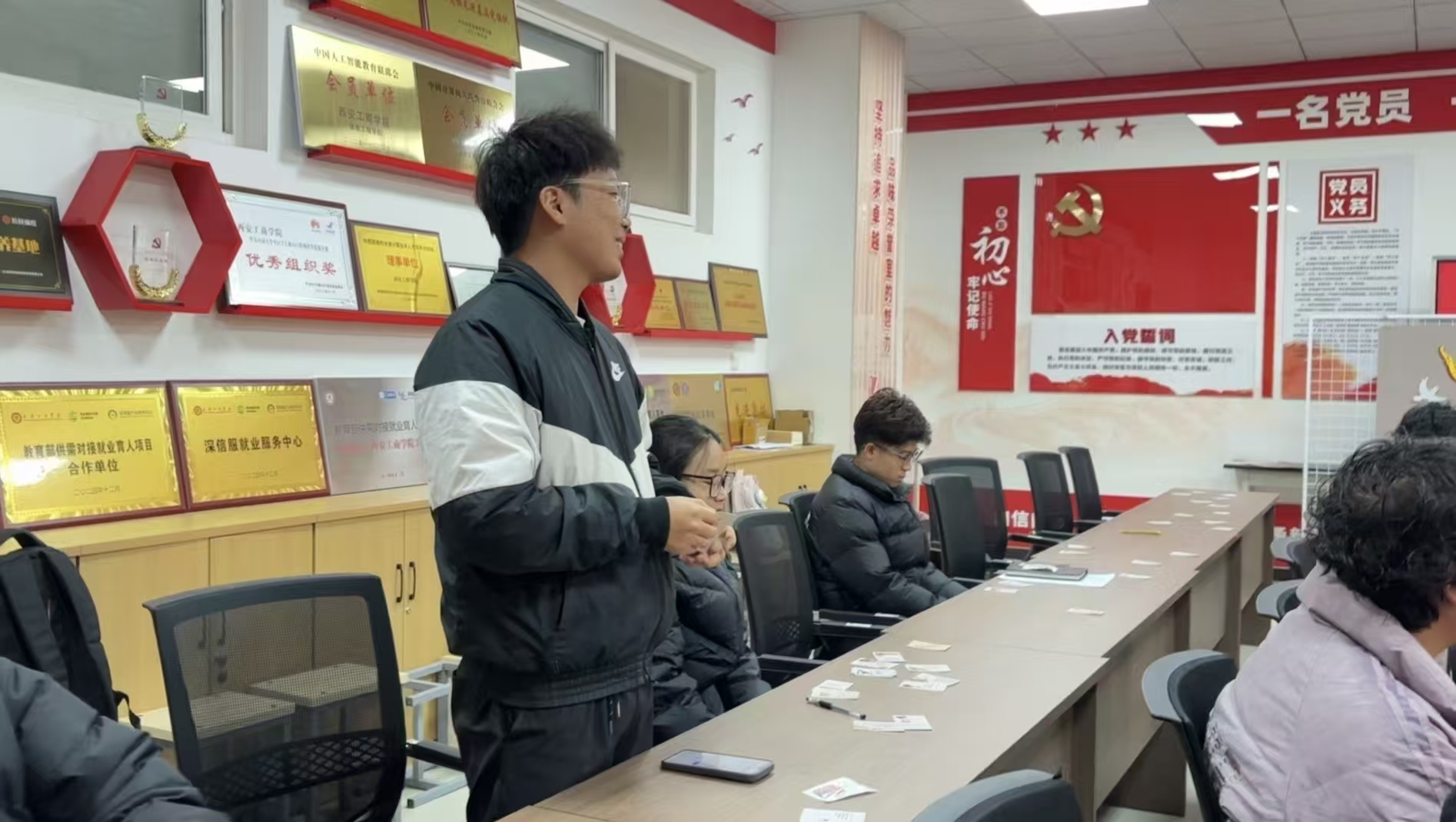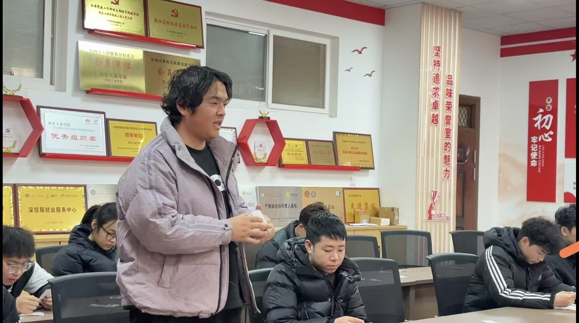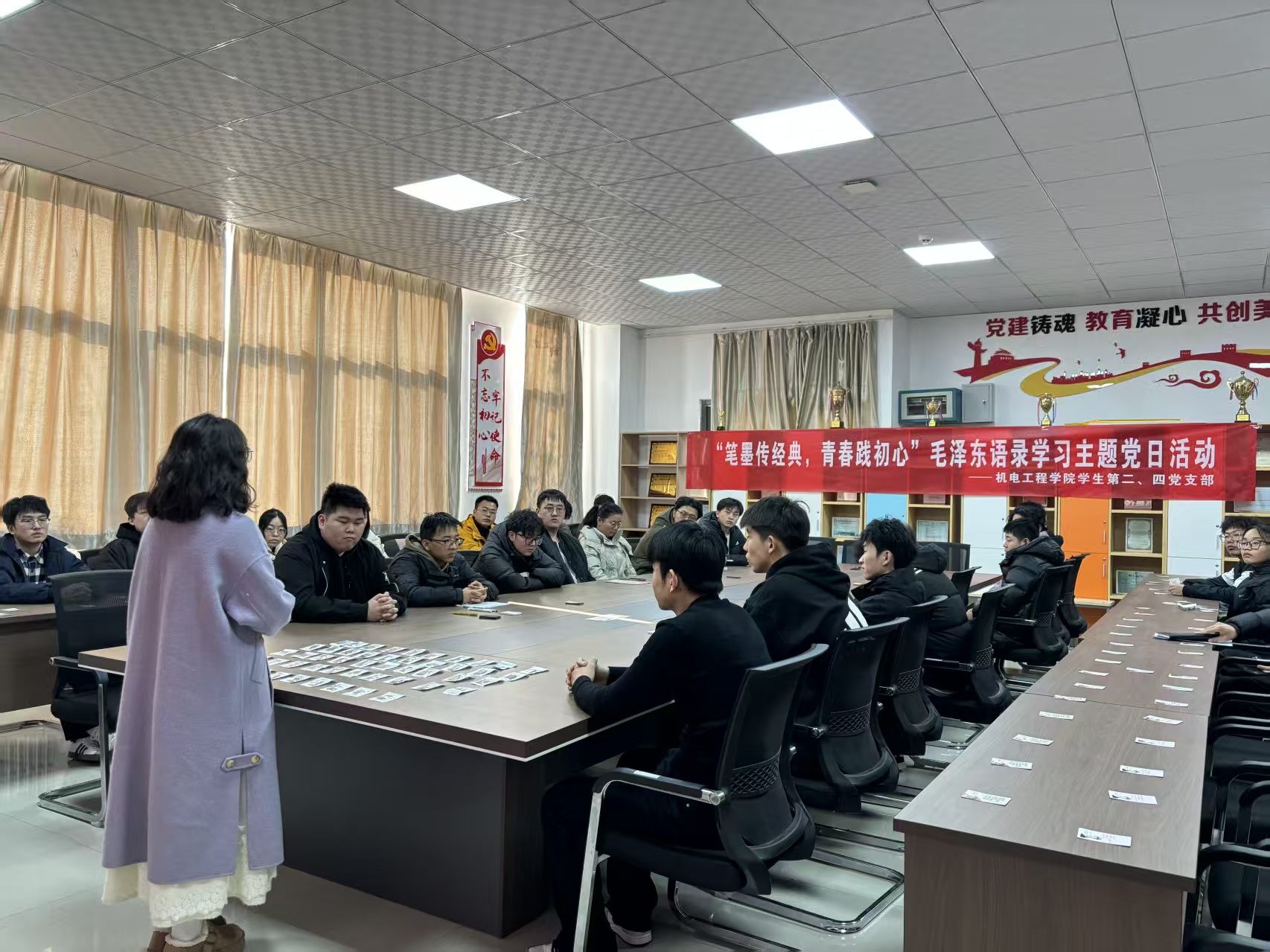 12月10日,机电工程学院学生第二、四党支部联合主办的“笔墨传经典,青春践初心”毛泽东语录学习主题党日活动在实验楼301顺利举行。参加活动的学生党员、发展对象及入党积极分子齐聚一堂,在沉浸式体验中感悟红色文化魅力,凝聚爱国爱党奋进力量。