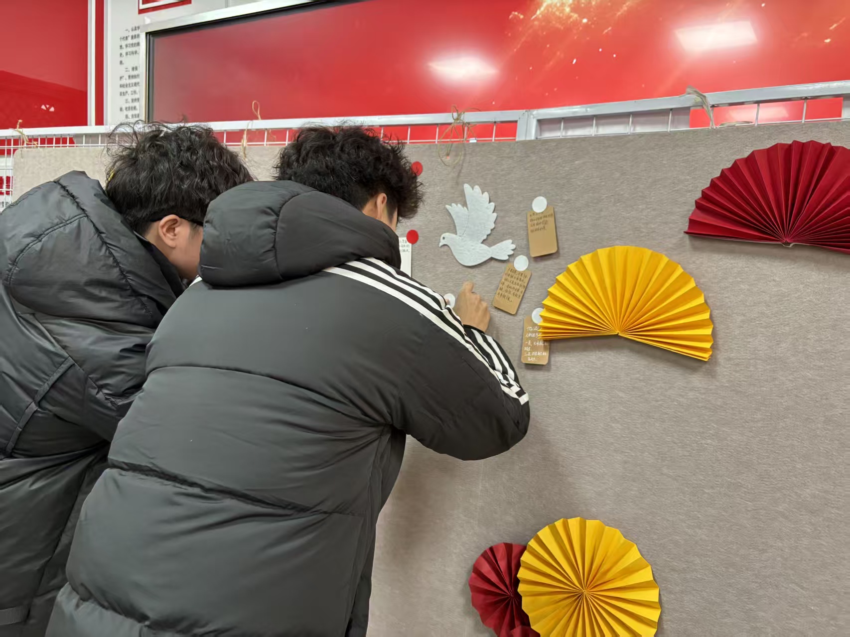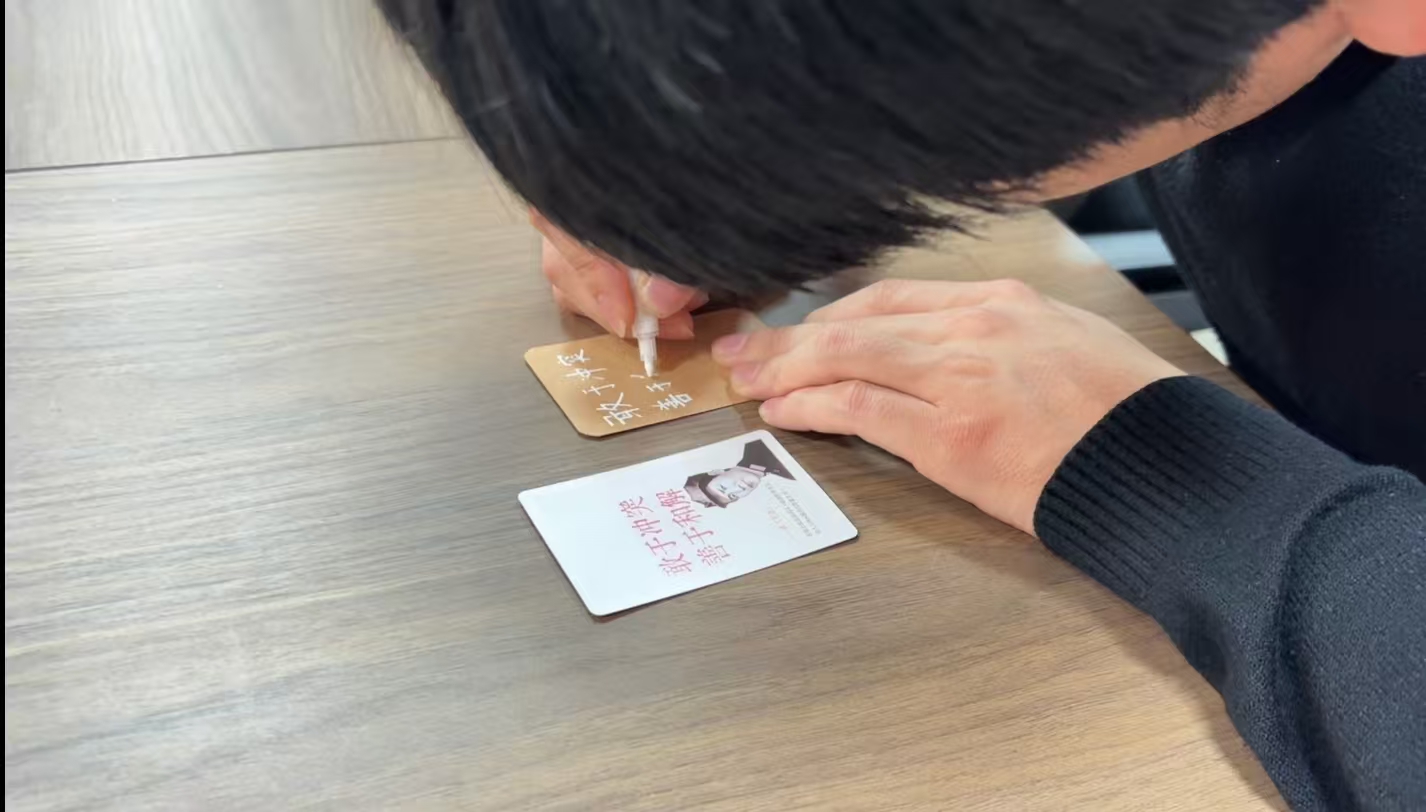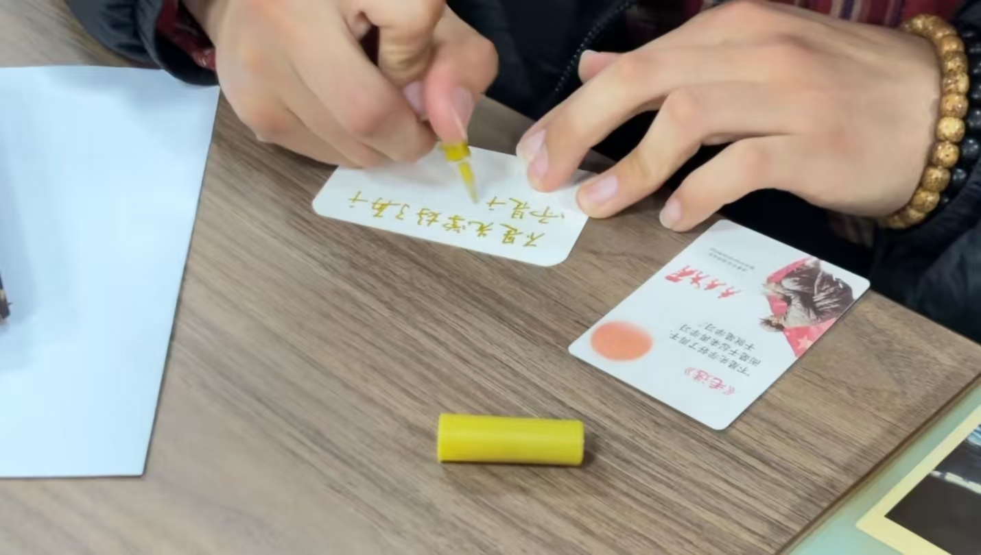 在“笔墨传情·摘抄经典”环节,参与者自主选取心仪的毛泽东语录卡片,用笔墨将经典字句誊抄至空白卡片上,随后逐一将卡片贴于留言墙。一张张承载着红色精神的卡片,直观展现了经典著作的思想力量,也寄托了青年一代对党的赤诚之心。