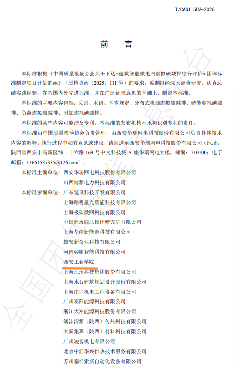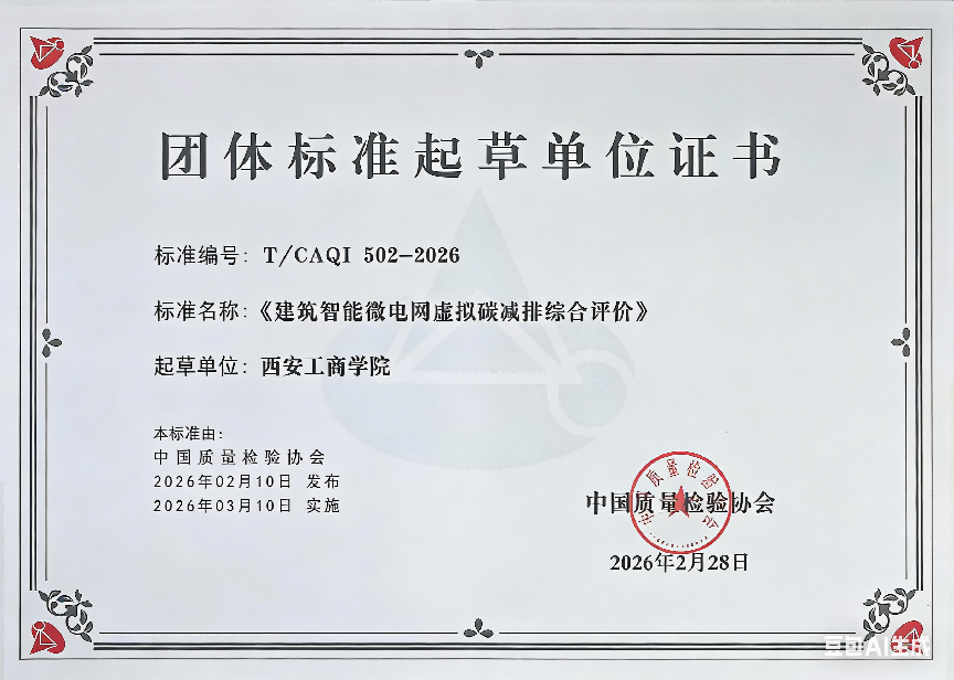 近日,中国质量检验协会传来喜讯,由西安工商学院机电工程学院电气工程与自动化系系主任李雪梅参与制定的《建筑智能微电网虚拟碳减排综合评价》标准正式发布。该标准自2025年立项草案,于2026年3月10日正式实施。李雪梅主任的深度参与,标志着我校在电气工程及“双碳”领域的学术影响力实现重要突破。