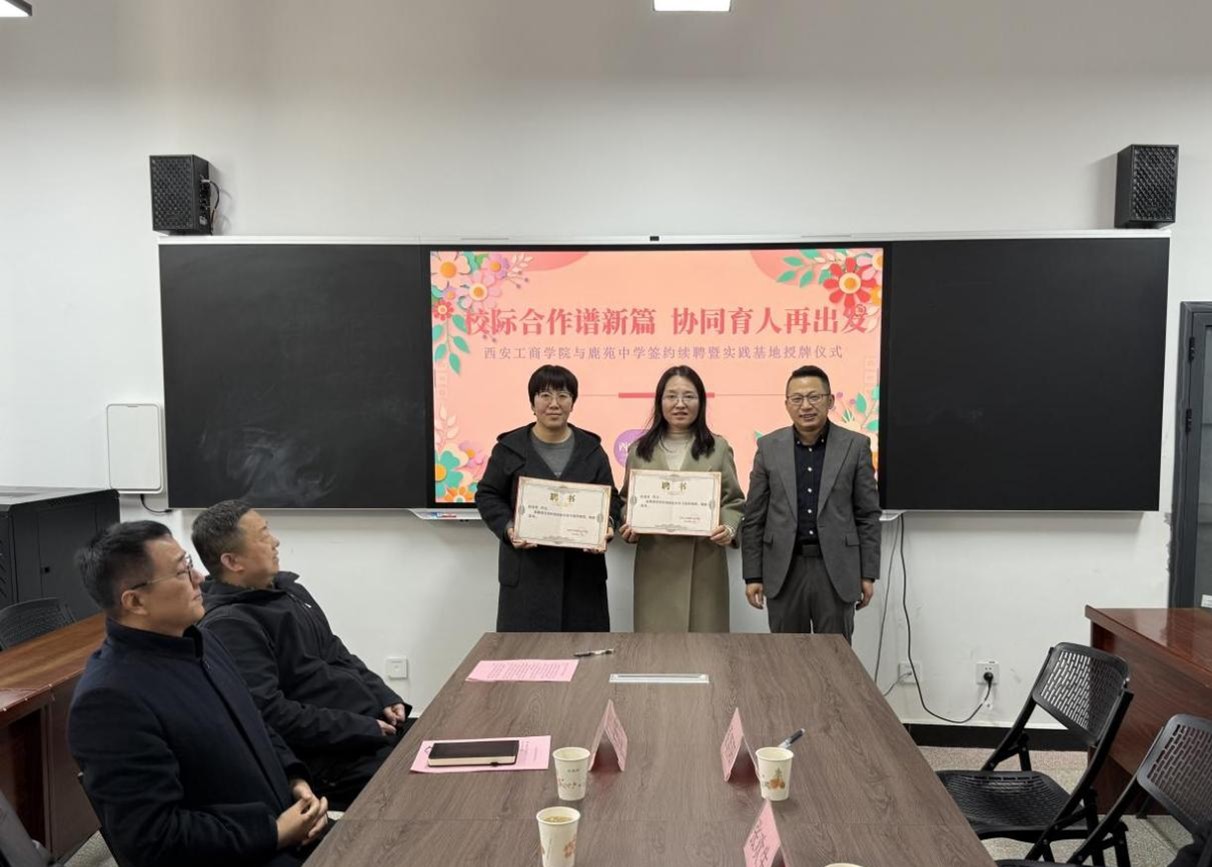 座谈会后,双方代表共同签署合作协议,正式完成续约。随后,西安工商学院向鹿苑中学授予“实践教学合作基地”牌匾,标志着双方在实践育人领域的合作迈向新台阶。同时,为强化师资队伍建设,原朝阳为鹿苑中学教导主任刘淑侠和语文指导教师程丽君颁发聘书,聘请其担任实习指导教师,推动高校与中学师资力量的双向流动与共同成长。