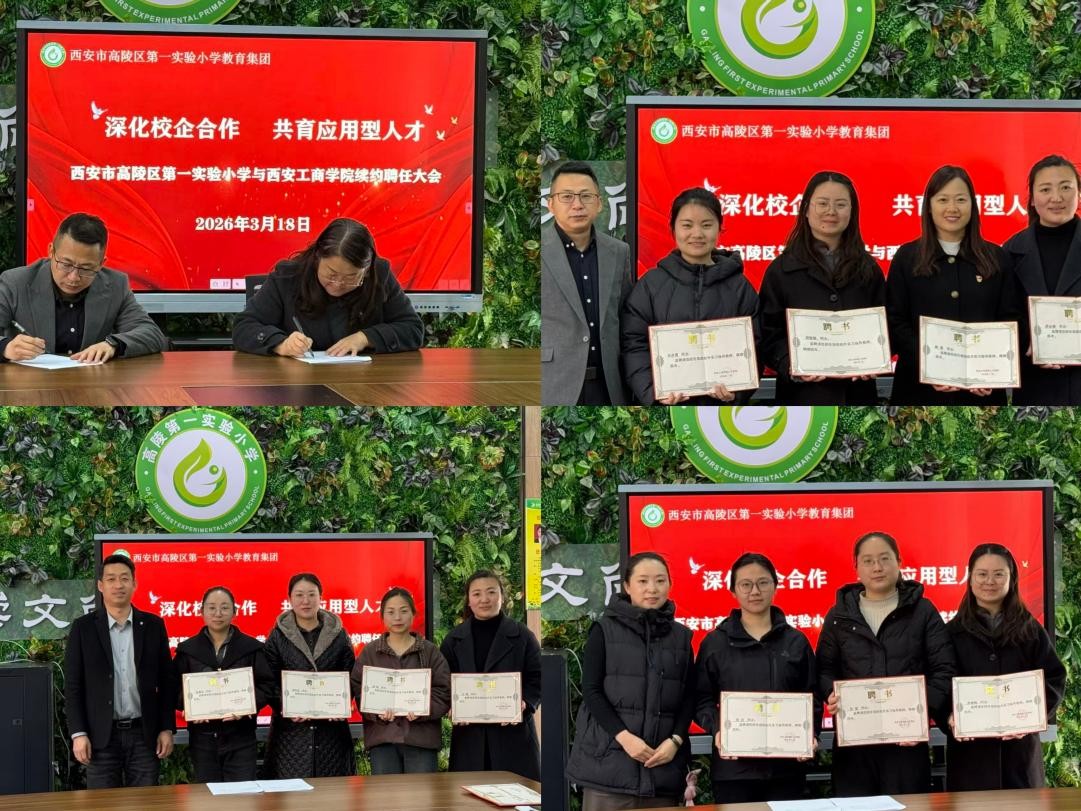 随后,原朝阳与赵荣香校长共同完成签约仪式,为双方深度合作奠定坚实基础。西安工商学院人文学院领导及教师代表为高陵区第一实验小学优秀实习指导教师颁发聘书,进一步巩固了两校合作关系。双方围绕产教融合、人才培养模式创新、实践教学基地建设等议题深入交流,并就AI智能技术赋能教育发展达成共识,将共同探索新时代教育高质量发展新路径,助力教育事业提质增效。