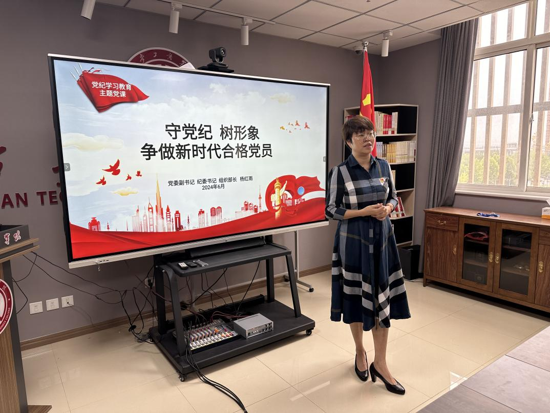 党办质保党支部在图书馆党建会议室开展了党纪学习教育专题党课,活动上党委副书记杨红雨同志为支部所有党员讲述了一堂题为“守党