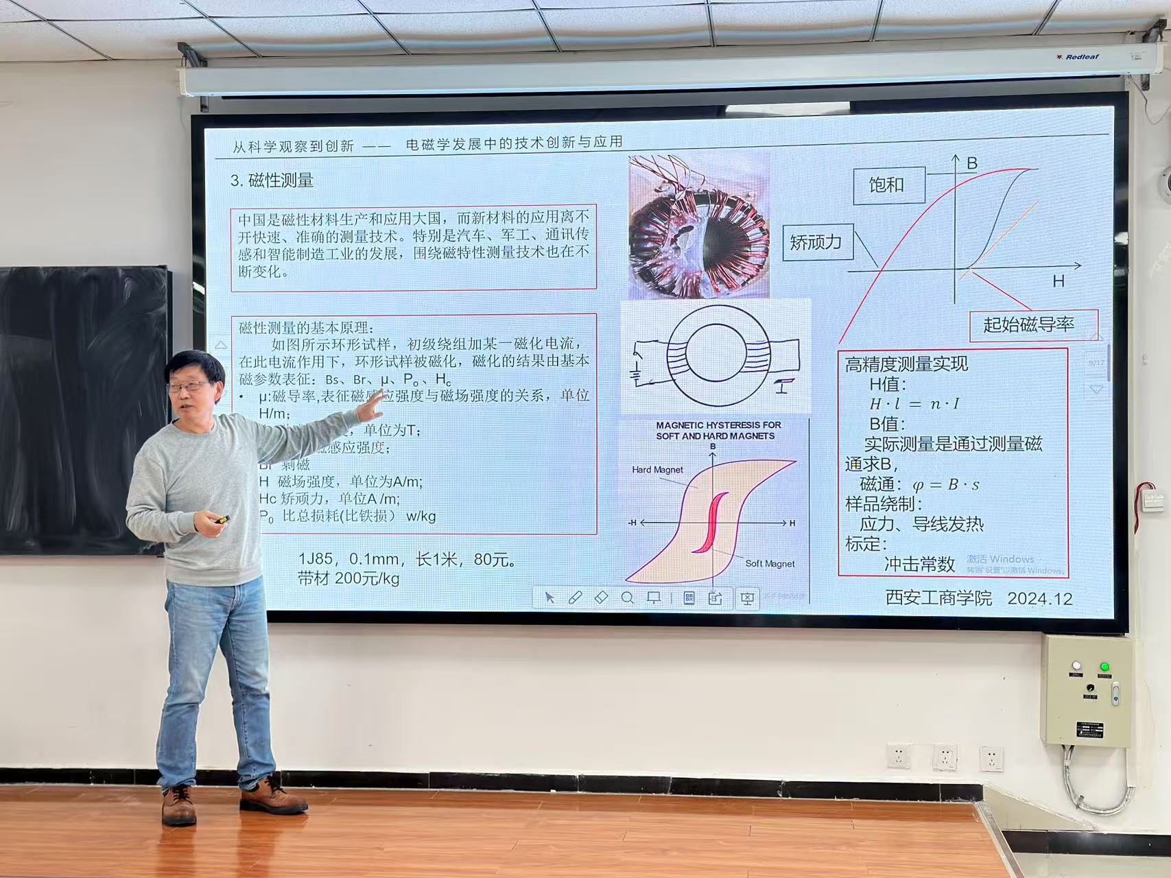 董威教授做了题为“从科学观察到创新—电磁学发展中的技术创新与应用”的学术报告。董教授从法拉第的成长经历讲起,告诉大家敢于实践和创新对于科研工作者至关重要。随后,董威教授的报告主要围绕磁性材料在生产、加工与检测方面的实际应用,通过大量生活、实验案例向现场师生介绍了材料的磁性、磁性材料分类、磁性测量等专业知识。董教授强调从实验现象引出思考,通过问题的解决推动新技术的应用,形成新的理论,这就是创新。在这个过程中,测量的准确性和可验证性尤为关键。最后董教授强调,法拉第从一个无学历背景的青年成长为对科学事业做出巨大贡献的伟大科学家,离不开他敏锐的观察力、深刻的思考能力以及将观察与思考紧密结合的实践能力。他鼓励广大师生不唯学历,扎实做研究、善于观察和思考,努力提升自身业务能力和科学素养,勇攀学术高峰。董威教授专业、严谨、细致的讲座赢得了现场听众的一致称赞。